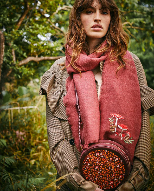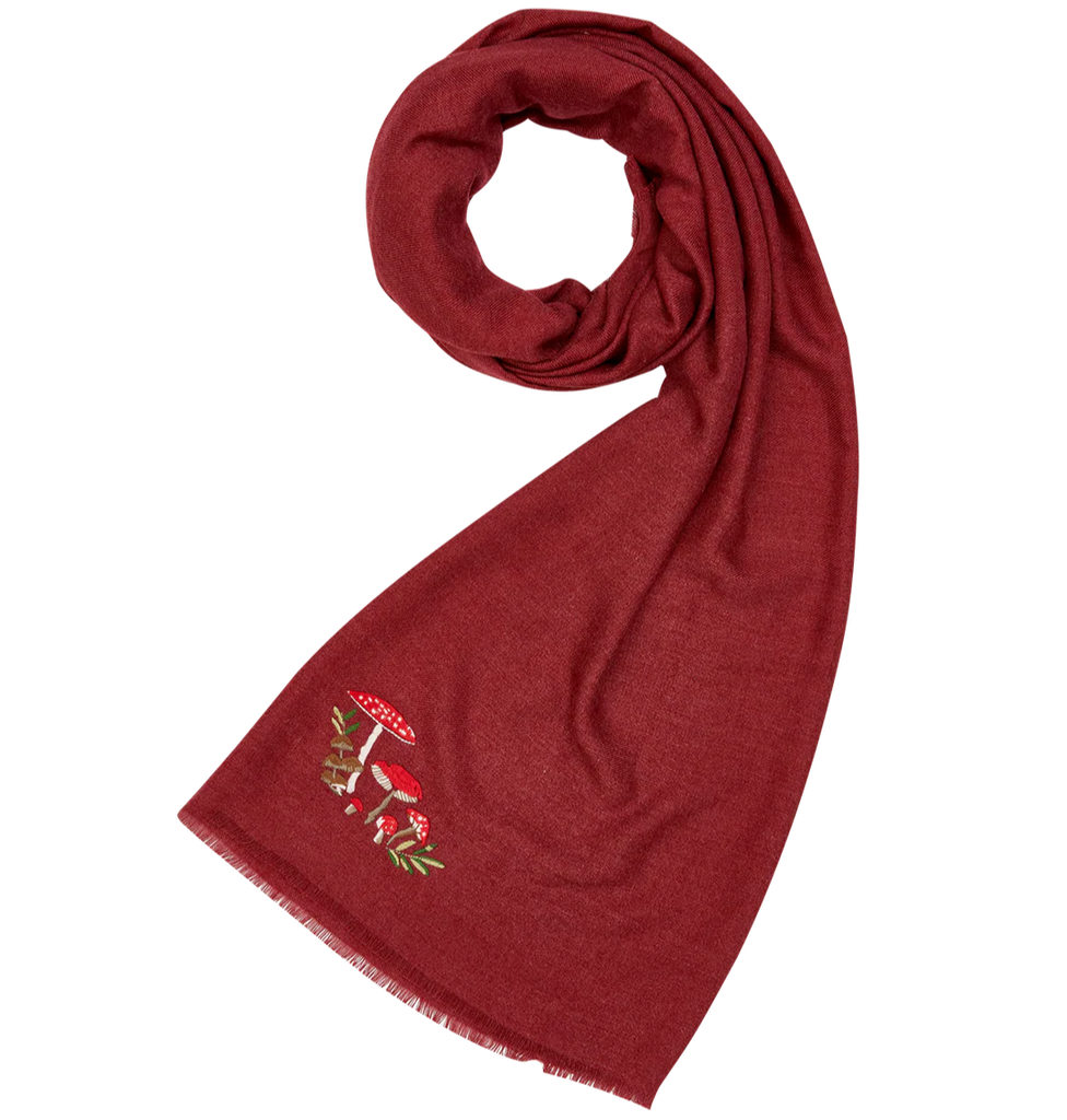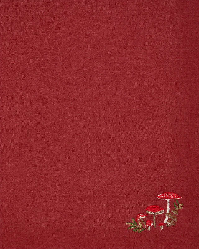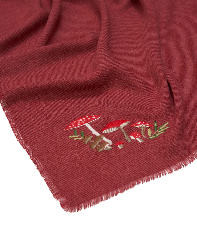 This cosy scarf from Fable features beautifully soft recycled burgundy red fabric, adorned with a sweet mushroom embroidered design.