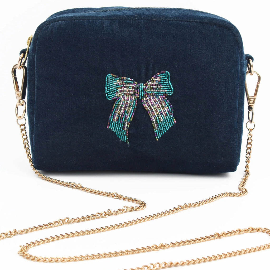 This stunning navy velvet bag from My Doris features a bow design embellished with blue, silver and iridescent beads.