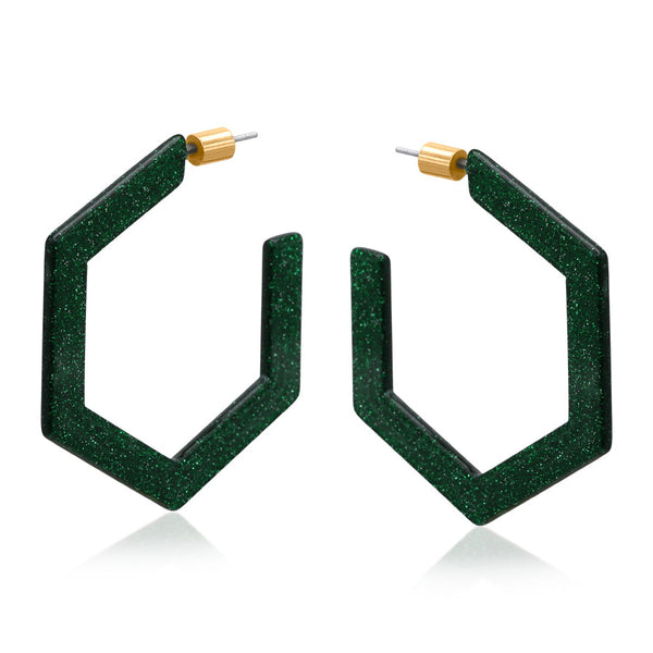 Big Metal London Green Glitter Hexagon Hoop Earrings