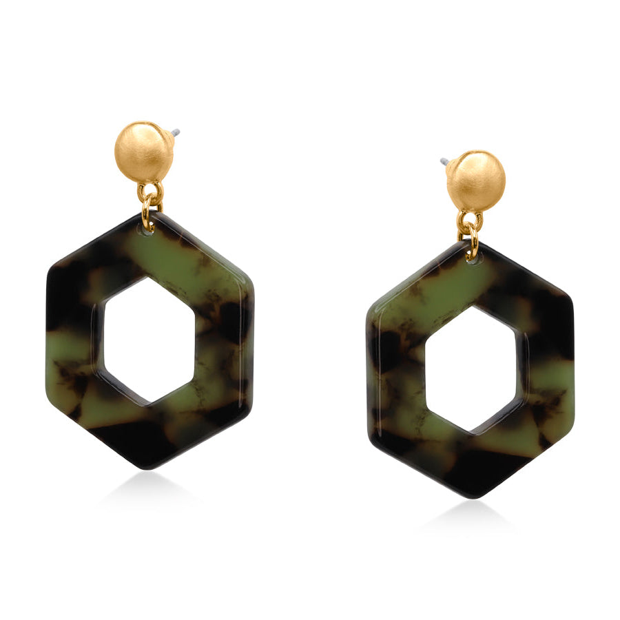 These statement geometric drop earrings from Big Metal London are crafted from recycled marbled black and green resin, each pair features its own unique colour variation.