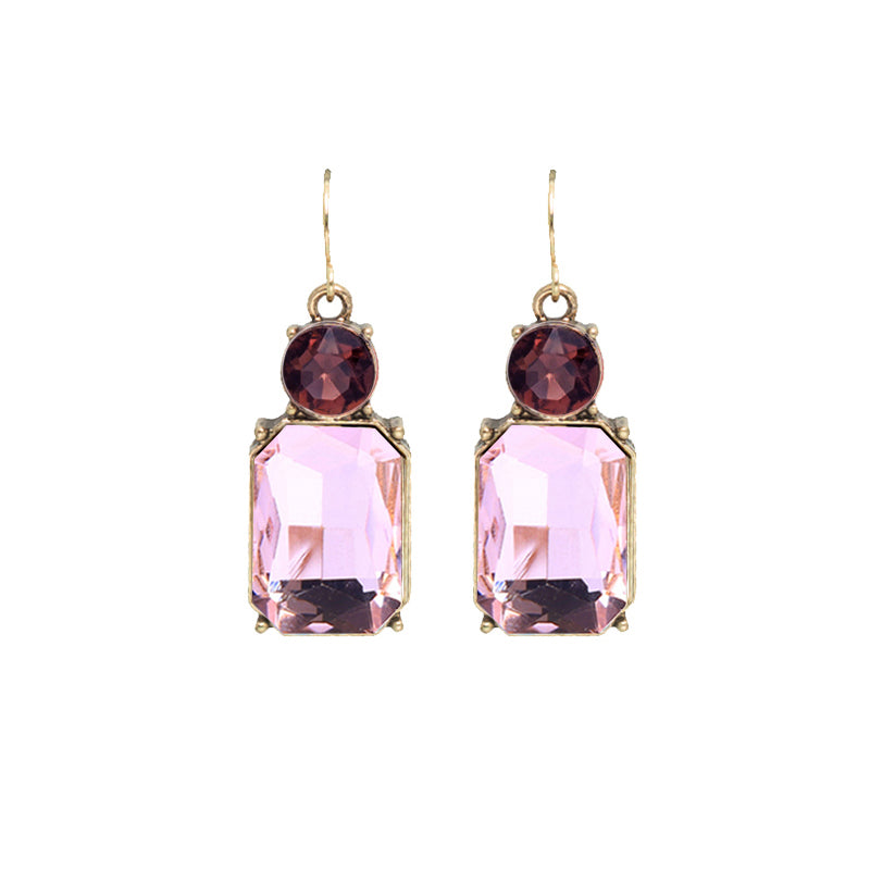 These beautiful earrings from Last True Angel feature a round burgundy gem sitting atop a pink rectangular drop.