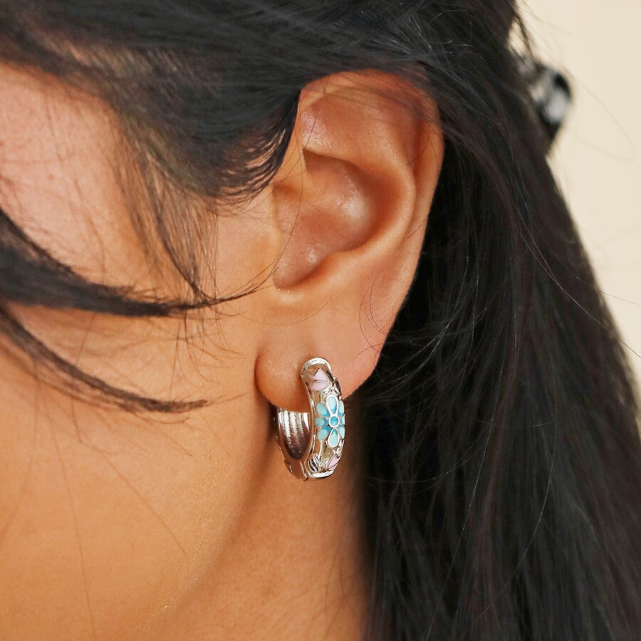 These gorgeous silver hoop earrings from Lisa Angel feature colourful enamel, detailed with a floral blue and lilac design in a cloisonné-inspired style.