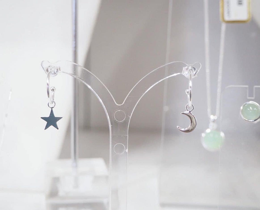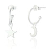 These gorgeous earrings from Spoke 925 feature a small hoop with delicate hanging star and moon charms. Crafted from sterling silver with an extra layer of silver plate and a high polish finish.Total drop measures 20mm, hoop measures 12mm diameter.