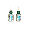 These beautiful earrings from Last True Angel feature a round emerald green gem sitting atop a rectangular drop in clear.