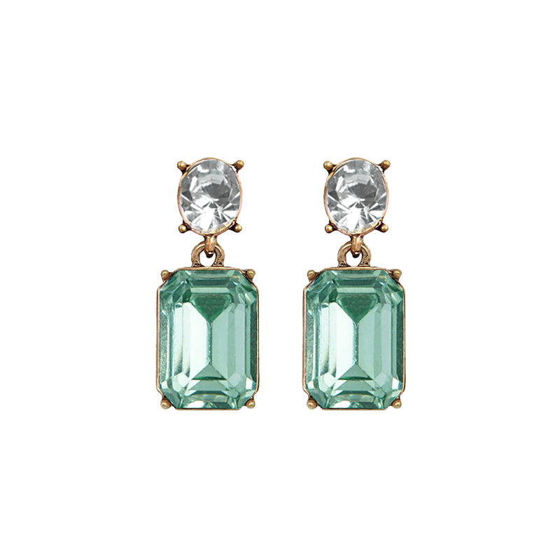 These beautiful earrings from Last True Angel feature an oval clear gem with a statement rectangular drop in mint green.