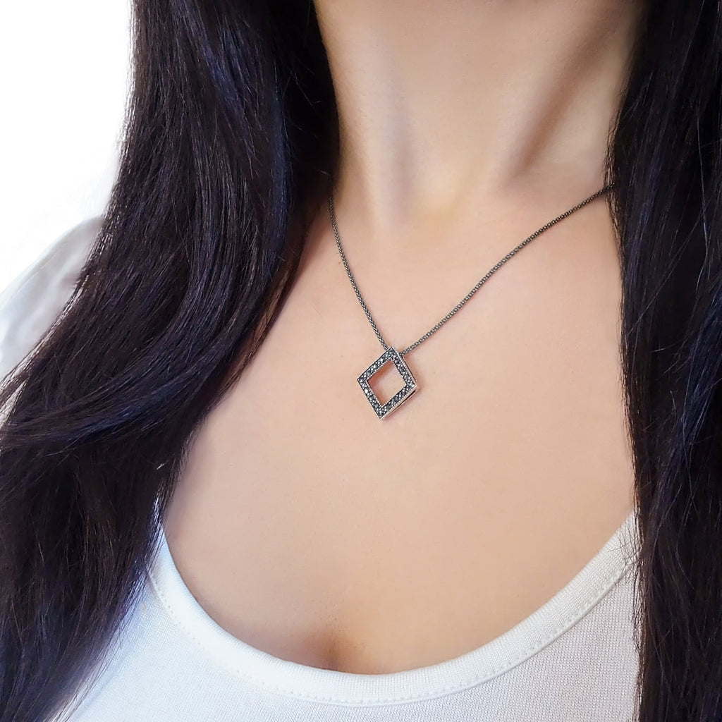 This beautiful sterling silver necklace from London Vintage features a rhombus shaped pendant, embellished with sparkling marcasite stones.