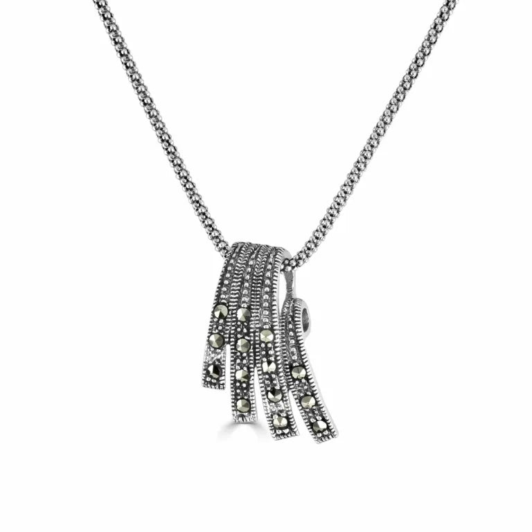 This beautiful sterling silver necklace from London Vintage features a classic fan pendant, embellished with marcasite stones.