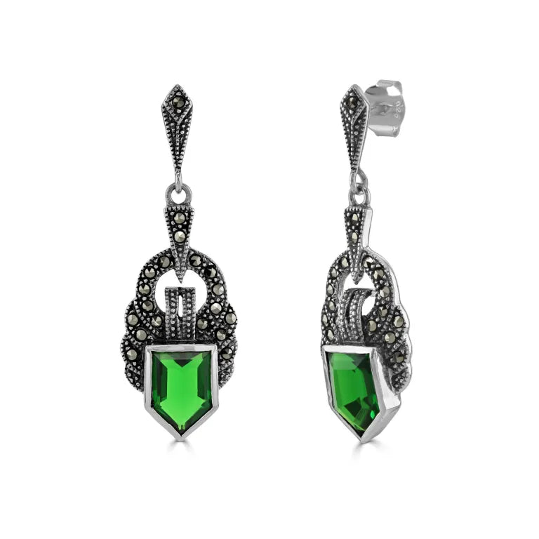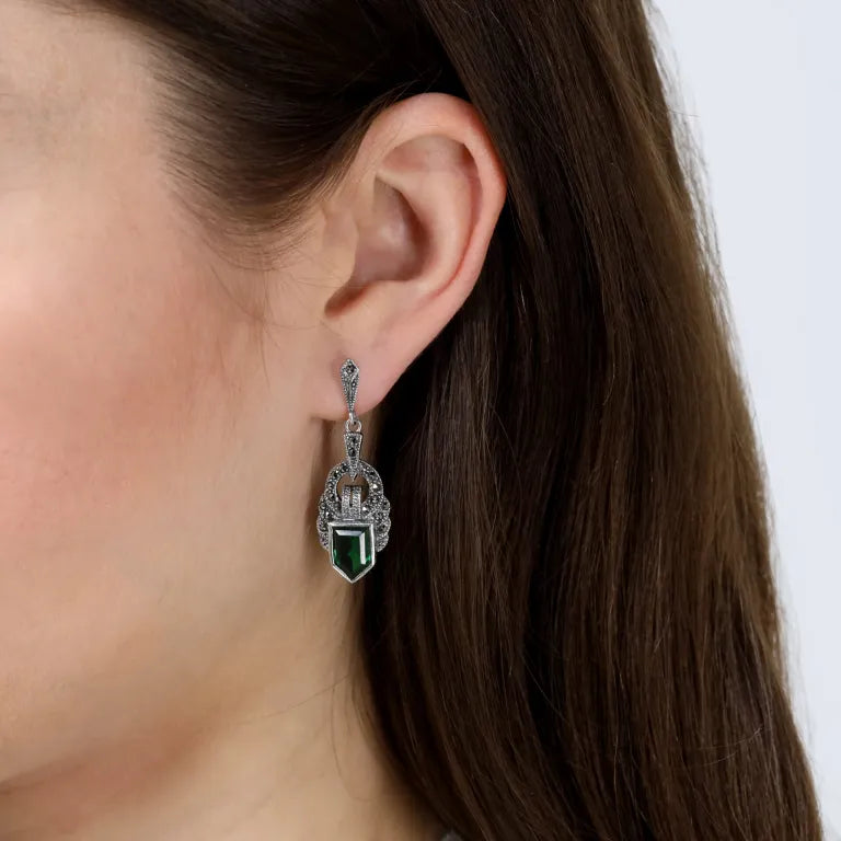 These beautiful statement earrings from London Vintage feature a stunning Art Deco design, embellished with emerald green cubic zirconia and marcasite stones.