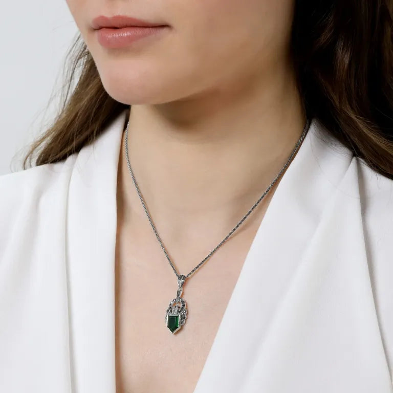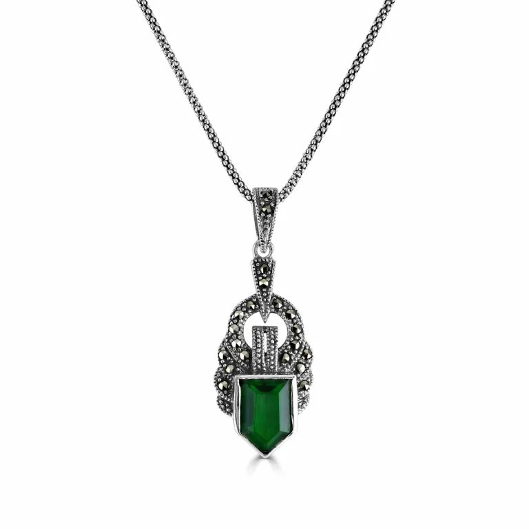 This beautiful sterling silver necklace from London Vintage features an Art Deco pendant, embellished with emerald green cubic zirconia and marcasite stones.