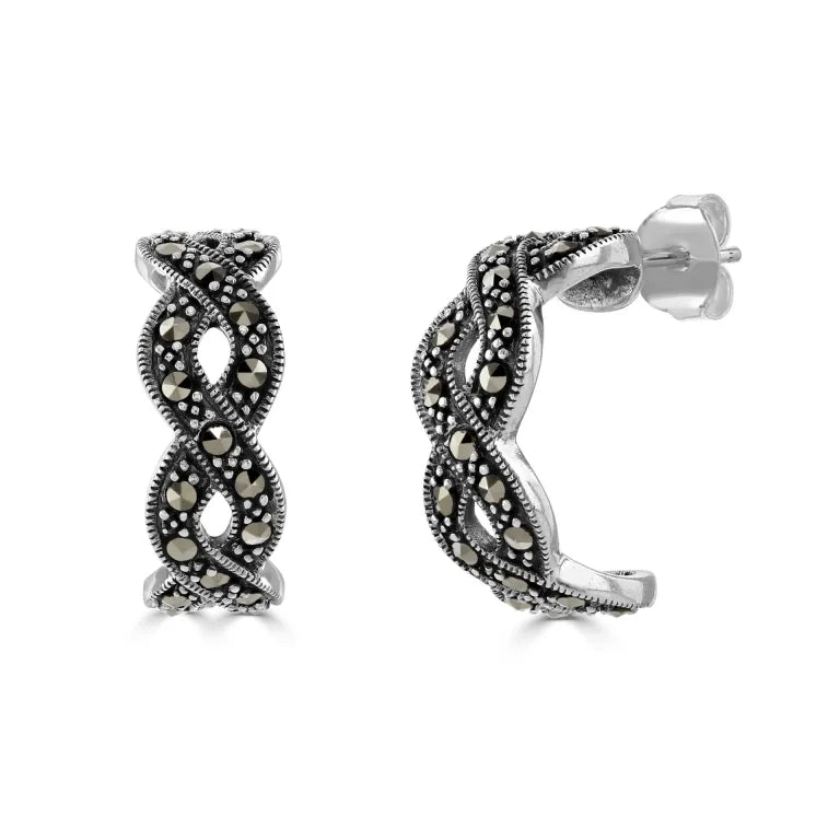 These beautiful sterling silver half twist hoop earrings from London Vintage are embellished with marcasite stones.