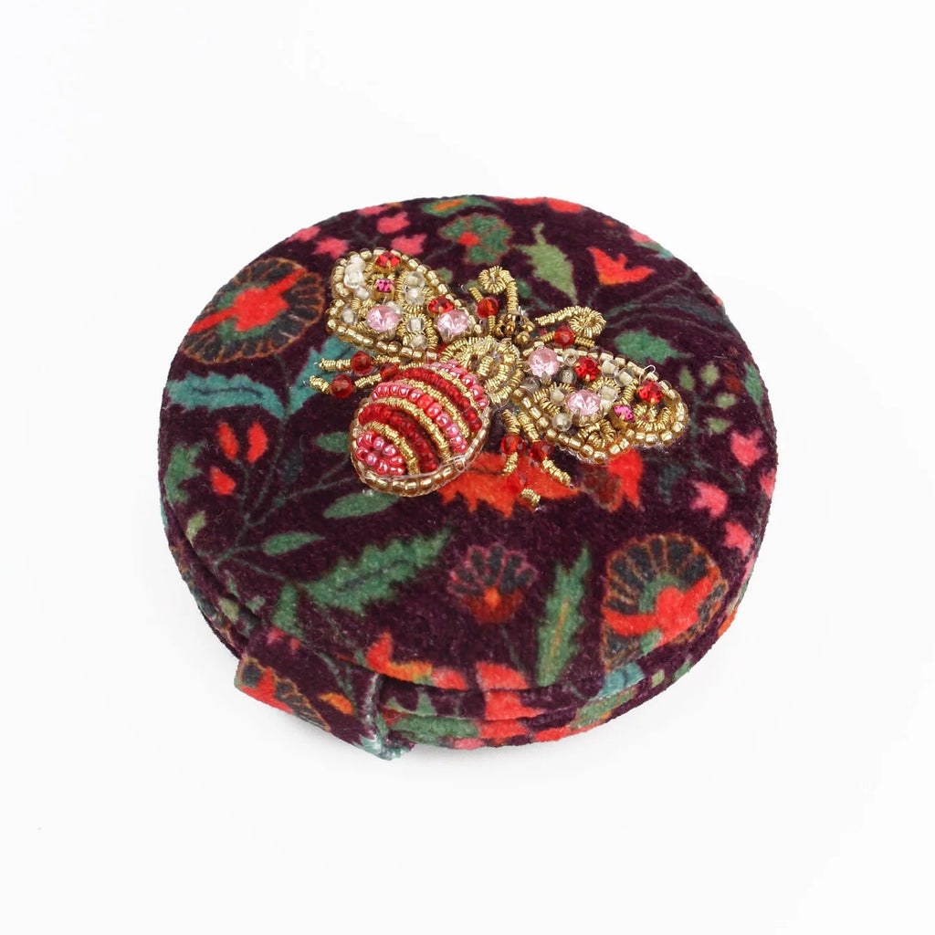 This beautiful compact mirror from My Doris features autumnal patterned velvet, embellished with a hand-beaded pink and red golden bee.