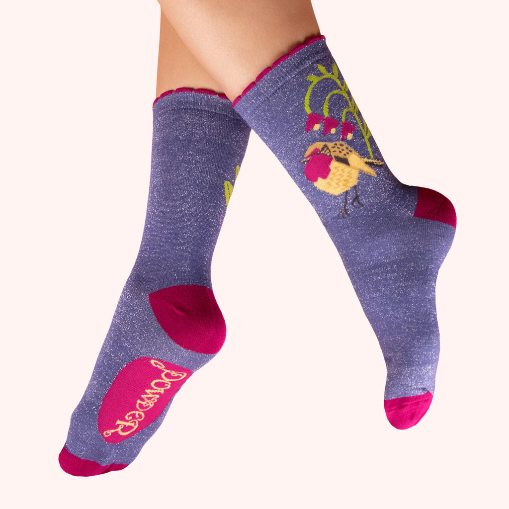 These beautifully soft bamboo socks from Powder feature a festive robin design on a glittery background.