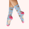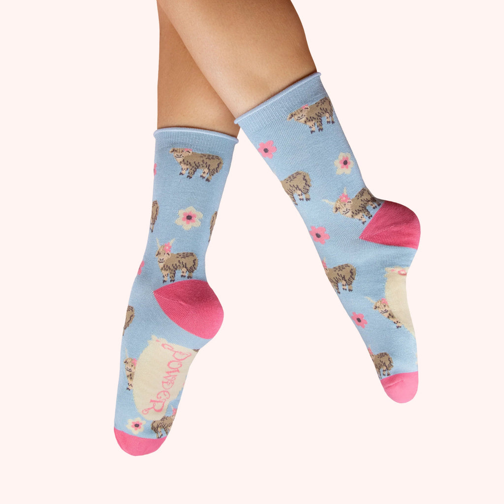 These beautifully soft bamboo socks from Powder feature a super sweet highland cow design against a baby blue background.