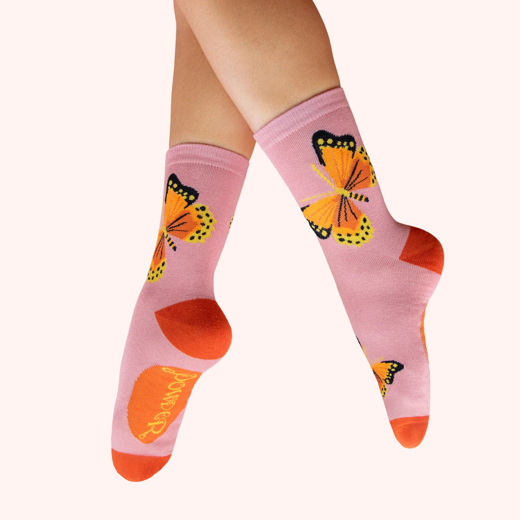 These beautifully soft bamboo socks from Powder feature a gorgeous butterfly design against a rose pink background.