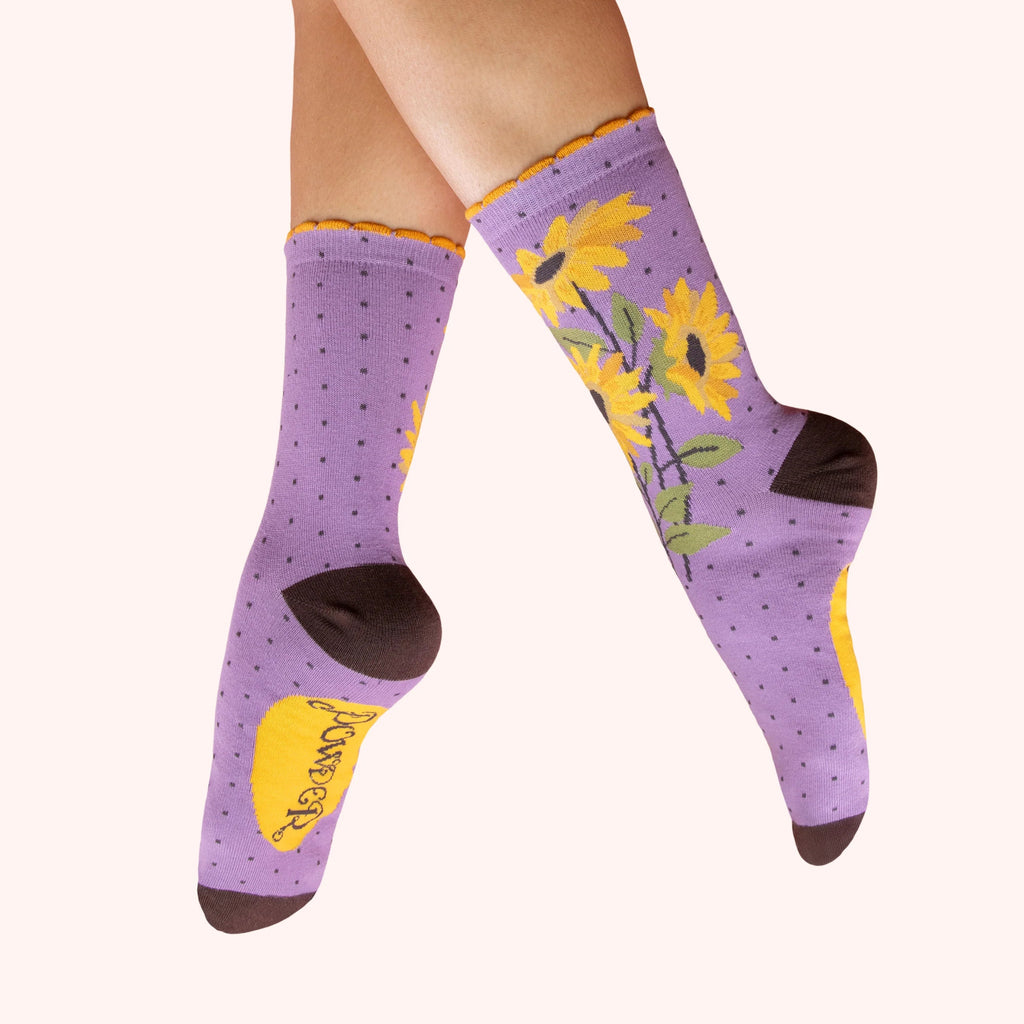 These beautifully soft bamboo socks from Powder feature a gorgeous sunflower design against a lilac purple background.