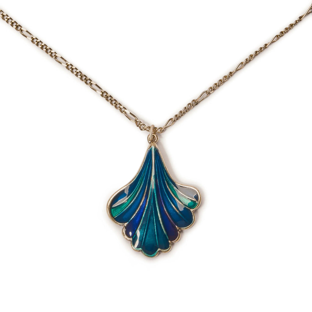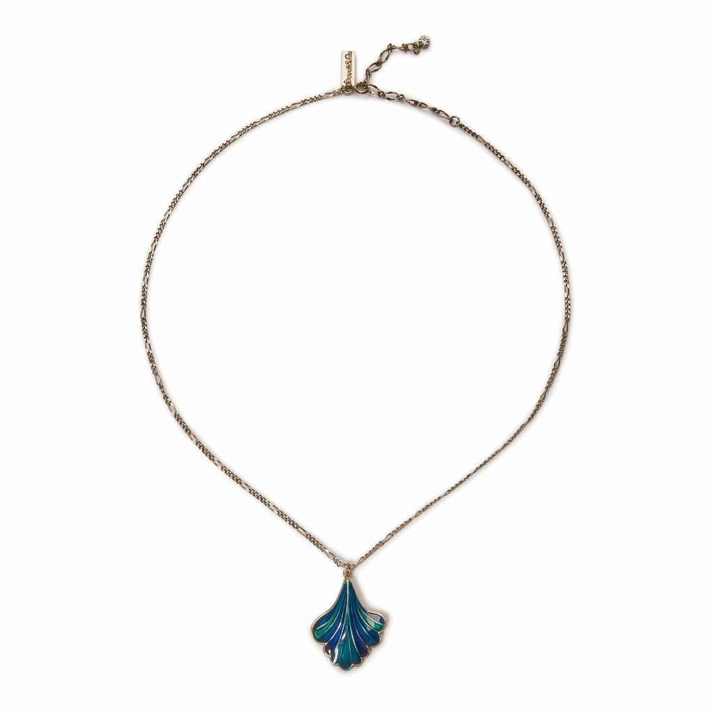 This beautiful necklace from Lovett and Co features a leaf shaped pendant, finished with hand painted enamel in blue and green.